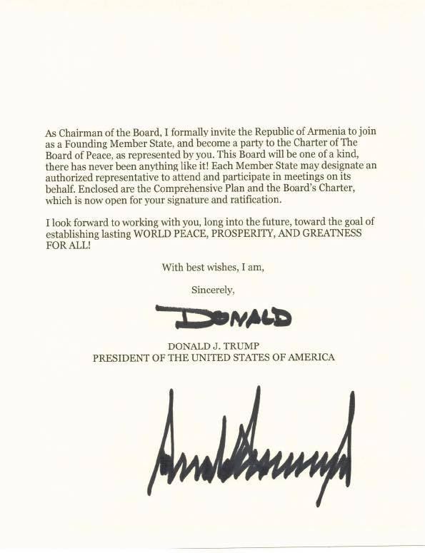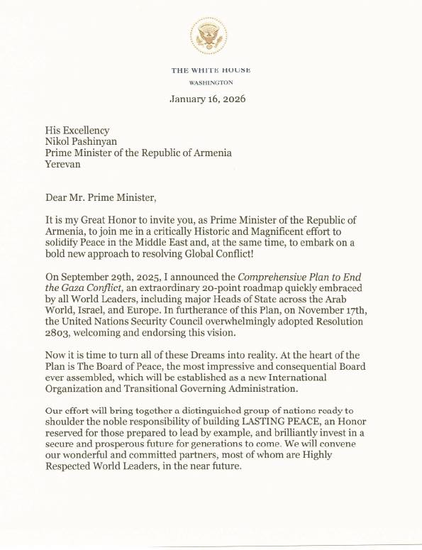 Նիկոլ Փաշինյանը ստացել է ԱՄՆ նախագահ Դոնալդ Թրամփի պաշտոնական հրավերը՝ Խաղաղության խորհրդին որպես հիմնադիր անդամ միանալու վերաբերյալ։