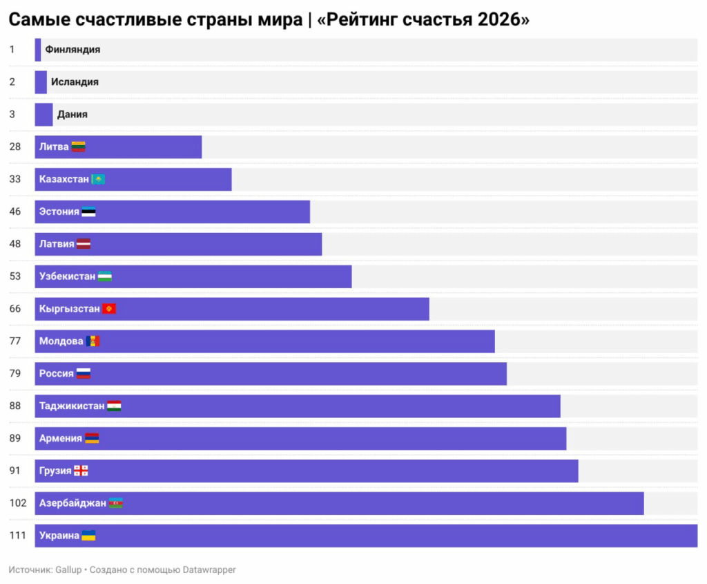 ԱՊՀ երկրների շրջանում ամենաերջանիկ երկրների ցանկը գլխավորում է Ղազախստանը, որը զբաղեցնում է 33-րդ տեղը։ Ղազախստանին հաջորդում են Ուզբեկստանը (53-րդ տեղ),Ղրղզստանը (66-րդ), Մոլդովան (77-րդ) , Ռուսաստանը (79-րդ) , Տաջիկստանը (88-րդ), Հայաստանը (89-րդ), Ադրբեջանը (102-րդ)։ 111-րդ տեղում Ուկրաինան է, որը ճանաչվել է ԱՊՀ տարածաշրջանի ամենադժբախտ երկիրը։