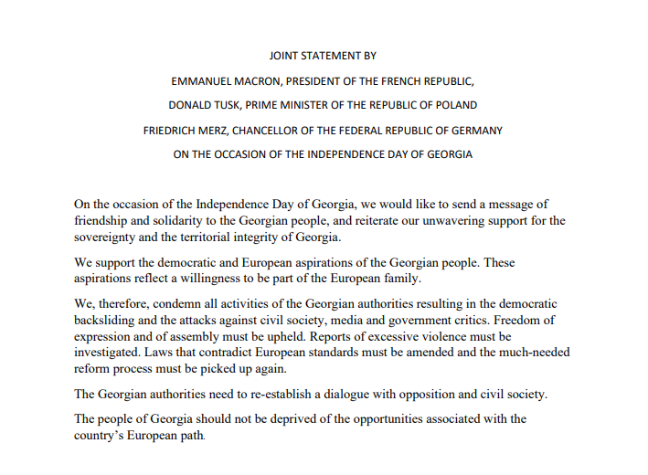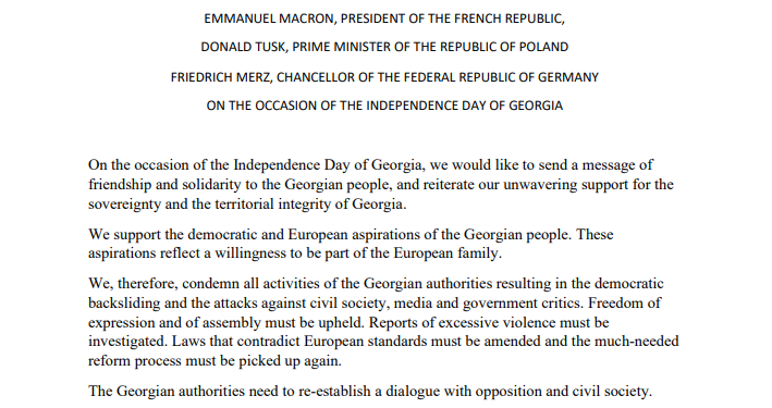 Վրաստանի անկախության օրվա կապակցությամբ Ֆրանսիայի նախագահ Էմանուել Մակրոնը, Գերմանիայի կանցլեր Ֆրիդրիխ Մերցը և Լեհաստանի վարչապետ Դոնալդ Տուսկը համատեղ բարեկամության և համերաշխության ուղերձ են հղել վրաց ժողովրդին և վերահաստատել իրենց անսասան աջակցությունը Վրաստանի ինքնիշխանությանը և տարածքային ամբողջականությանը։