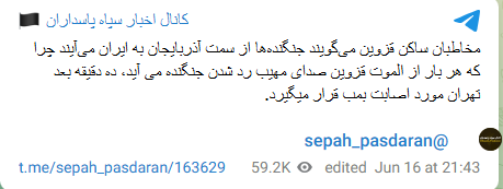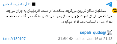 ԻՀՊԿ-ի անունով գործող որոշ իրանական տելեգրամյան ալիքներն այս օրերին տարածում են Ղազվինում բնակվող քաղաքացիների կողմից հաղորդված տեղեկություններ, որ իսրայելական հարձակումների ընթացքում կործանիչները գալիս են Ադրբեջանից։ Քաղաքացիներն ասում են, որ ամեն անգամ, երբ Ղազվինի Ալմութ շրջանից լսվում է կործանիչի հզոր ձայն, մոտ տասը րոպե անց Թեհրանը ռմբակոծվում է։