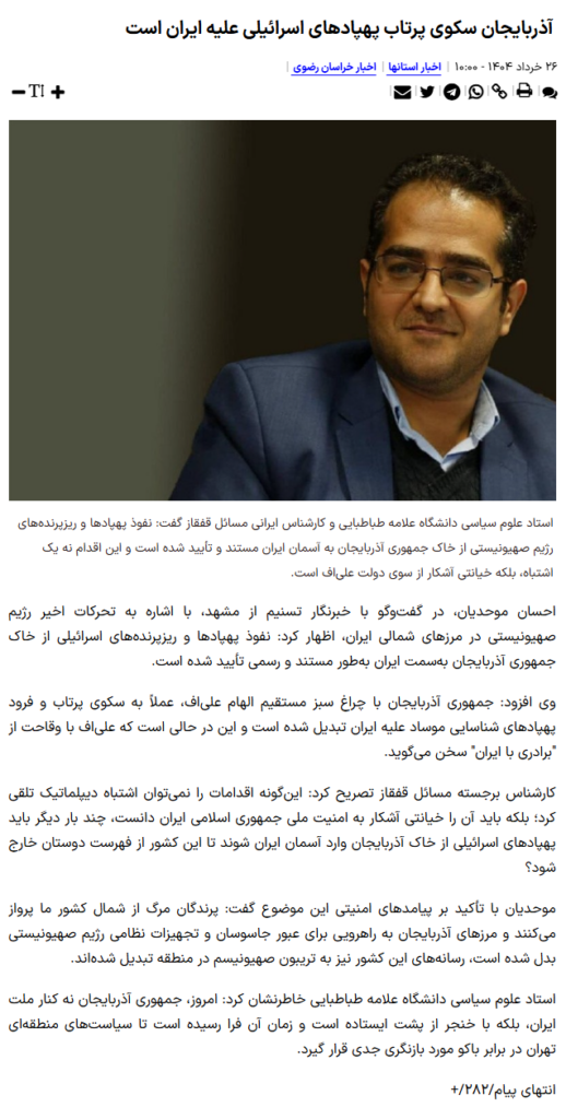 Անդրադառնալով Իրանի հյուսիսային սահմանների մոտ Իսրայելի հարձակումներին՝ այդ մասին բարձրաձայնել է նաև Իրանի Ալլամե Թաբաթաբայի համալսարանի քաղաքագիտության ֆակուլտետի դասախոս և Կովկասի հարցերով իրանցի վերլուծաբան Էհսան Մովհադեանն իրանական Tasnim գործակալությանը տված հարցազրույցում։