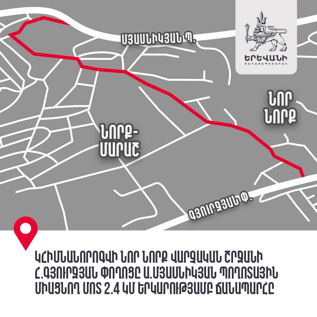 Կայացել է Նոր Նորք վարչական շրջանի Հ.Գյուրջյան փողոցը Ա.Մյասնիկյան պողոտային միացնող մոտ 2.4 կմ երկարությամբ ճանապարհի հիմնանորոգման նախագծի մրցույթը: Ինչպես հայտնում է Երևանի քաղաքապետարանը, չափագրումն ավարտված է: