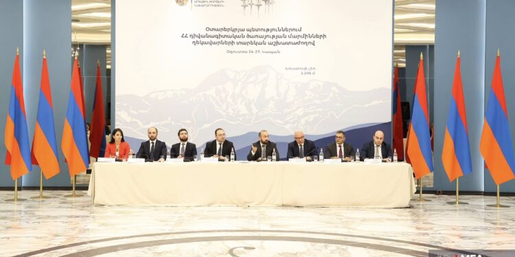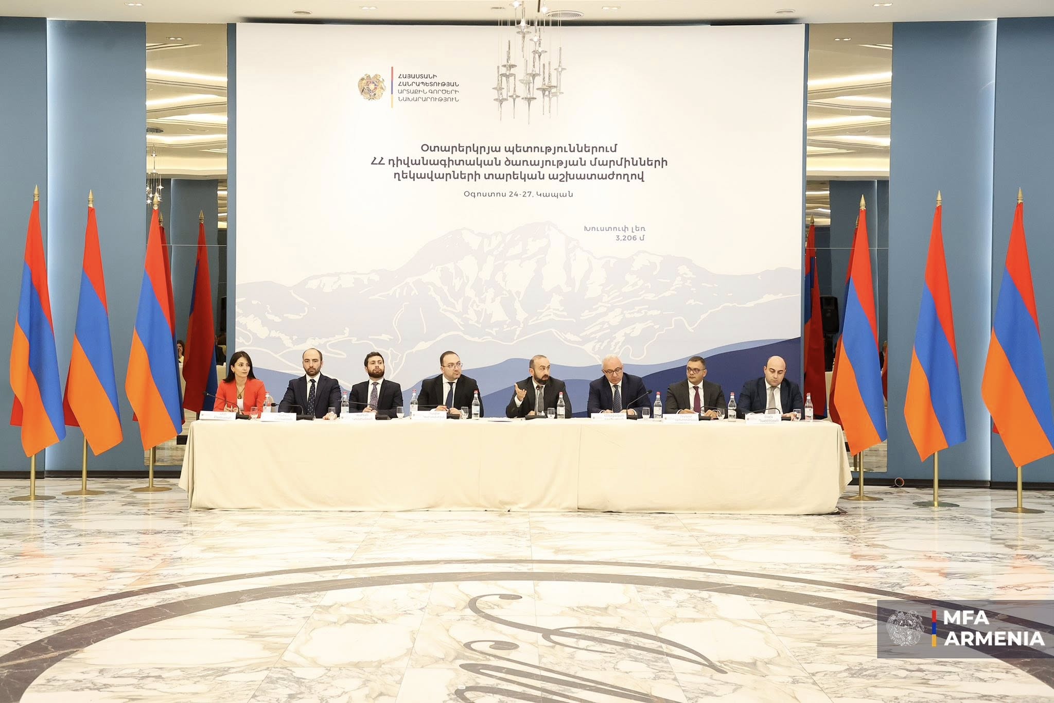 Կապանում ընթացող դեսպանահավաքի շրջանակներում ԱԳ նախարար Արարատ Միրզոյանի գլխավորությամբ քննարկում է տեղի ունեցել «Նոր իրավիճակ, նոր մտածելակերպ, նոր հնարավորություններ» թեմայով։