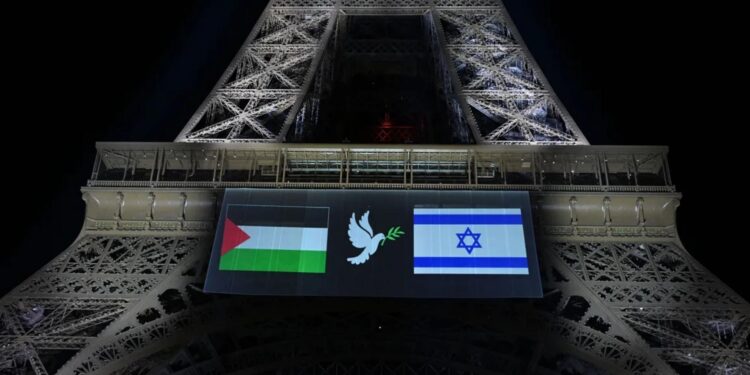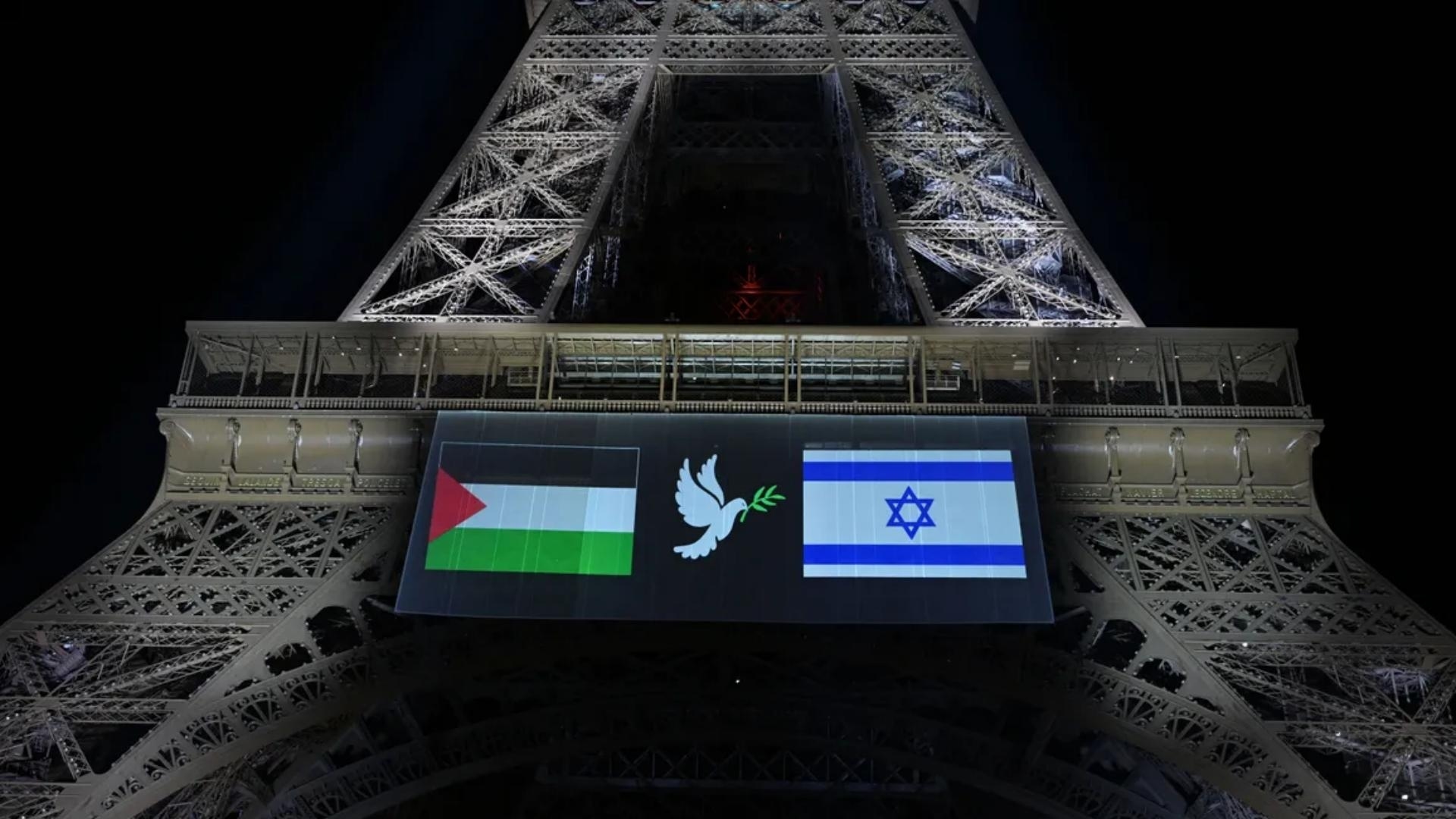 Ֆրանսիայի կողմից Պաղեստինի պետականության ճանաչումից առաջ Փարիզի իշխանությունները Պաղեստինի և Իսրայելի դրոշներ են տեղադրել Էյֆելյան աշտարակի վրա։ Երկու երկրների դրոշների միջև պատկերված է սպիտակ աղավնի։