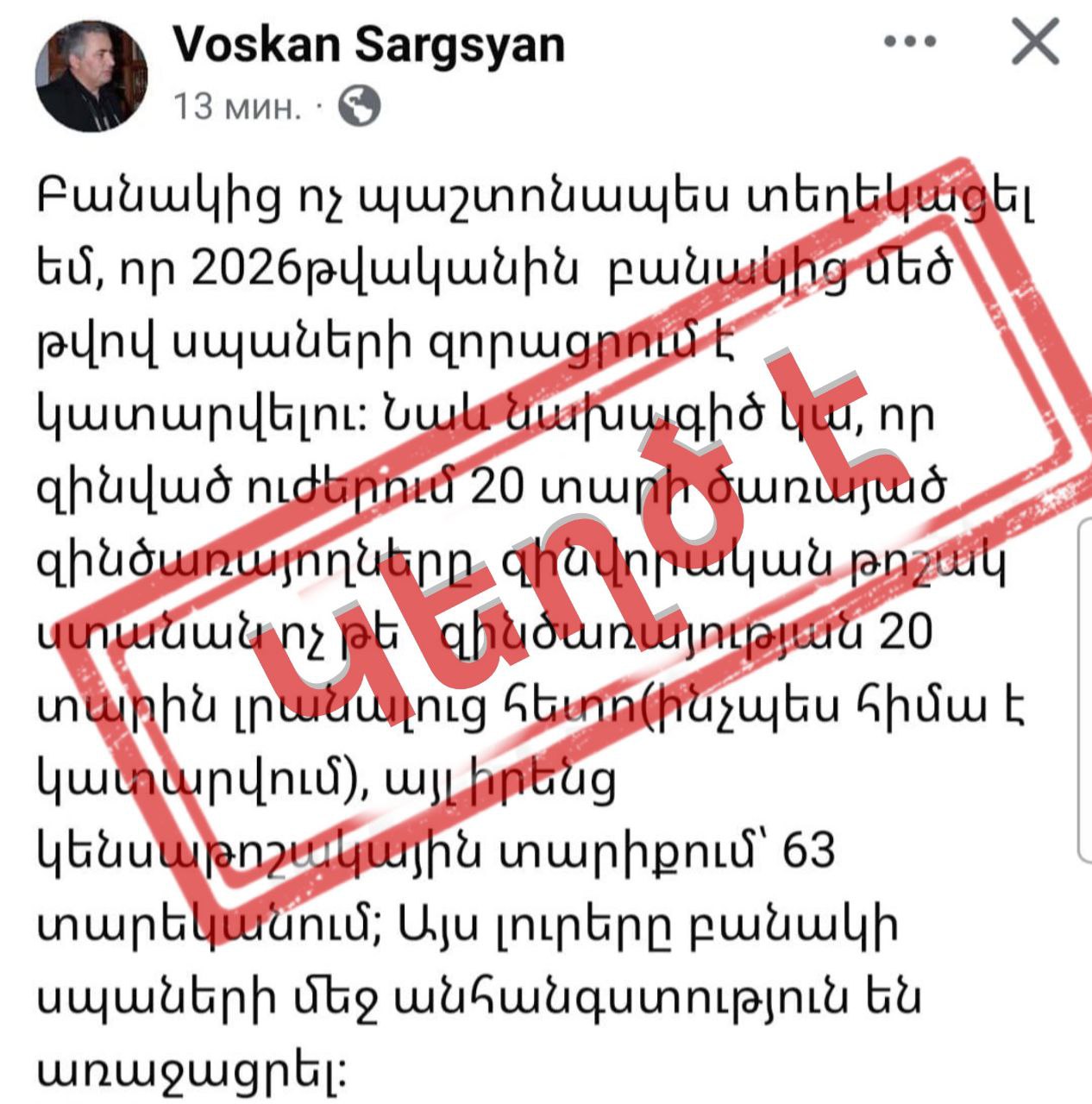ՀՀ պաշտպանության նախարարի մամուլի քարտուղար Արամ Թորոսյանը նշել է, որ այդ լուրերը կեղծ են և չեն համապատասխանում իրականությանը։