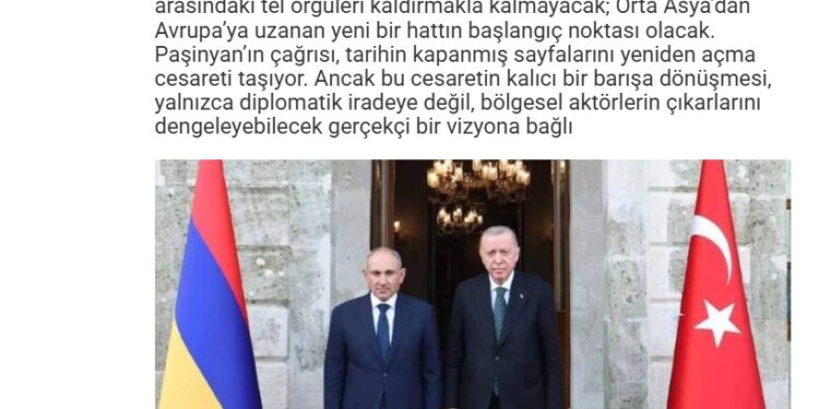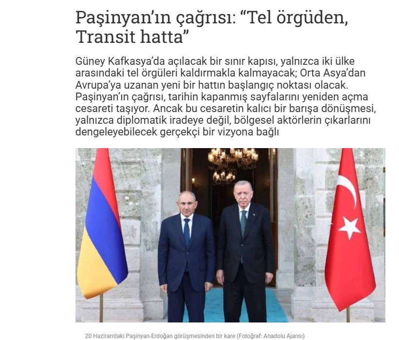 Հեղինակը մասնավորապես գրում է. «Հայաստանի վարչապետ Նիկոլ Փաշինյանի հայտարարությունը, որ Թուրքիայի հետ սահմանները կարող են բացվել, ուղղակիորեն վերաբերում է ոչ միայն երկու երկրների միջև դիվանագիտական հարաբերությունների կարգավորման գործընթացին, այլև Կենտրոնական Ասիայից մինչև Եվրամիություն ձգվող երկաթուղային և էներգետիկ գծերի ապագային: Այս կոչը ուշագրավ է որպես զարգացում, որը կարող է վերաձևավորել տարածաշրջանի աշխարհաքաղաքական քարտեզը: