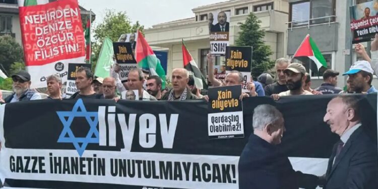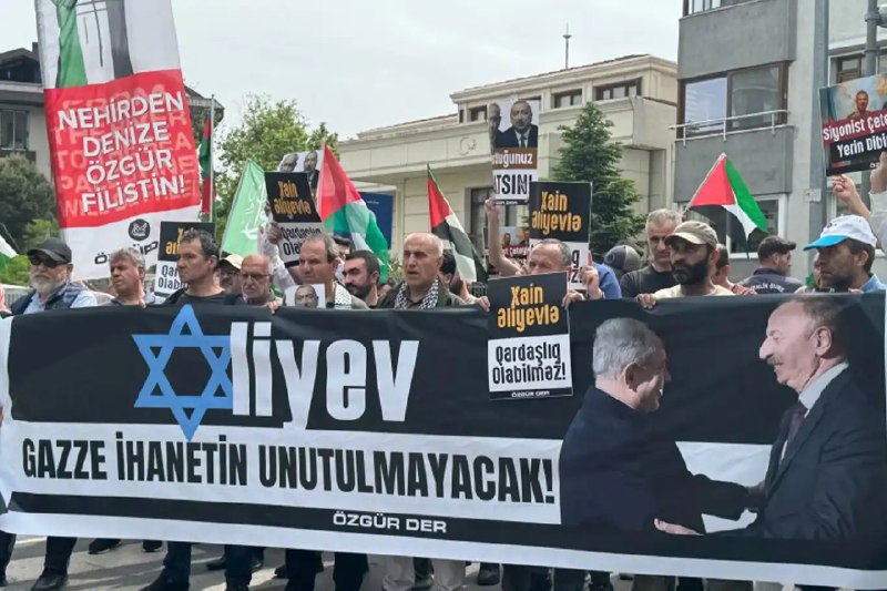 Несколько дней назад, 24 мая, перед зданием консульства Азербайджана в Стамбуле прошла акция протеста. С призывом к акции выступила «Ассоциация за права свободной мысли и образования» (Özgür-Der) — политическое и общественное исламское движение, действующее с 1999 года. Участники акции держали транспаранты с надписями «Не может быть братства с предателем Алиевым», «Пусть дружба с сионистским режимом достается писателю» и другими надписями.