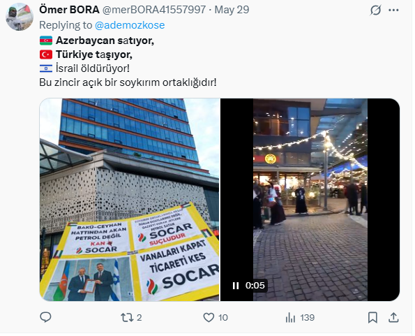 Некоторые турецкие СМИ и социальные сети сообщили, что в конце мая группа активистов провела акцию протеста в Стамбуле перед офисом азербайджанской государственной нефтяной компании SOCAR. Протестующие обвинили SOCAR, а затем и турецкое правительство в поставках нефти в Израиль.